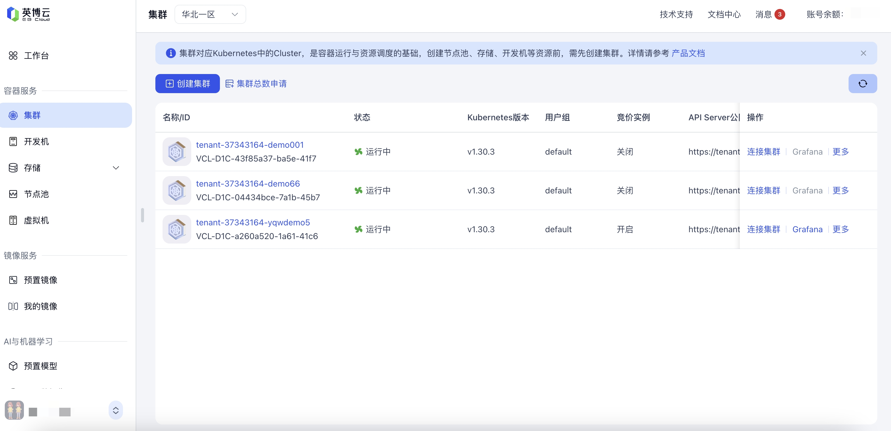 集群对应Kubernetes中的Cluster,是GPU容器服务计算、存储和网络资源的集合。