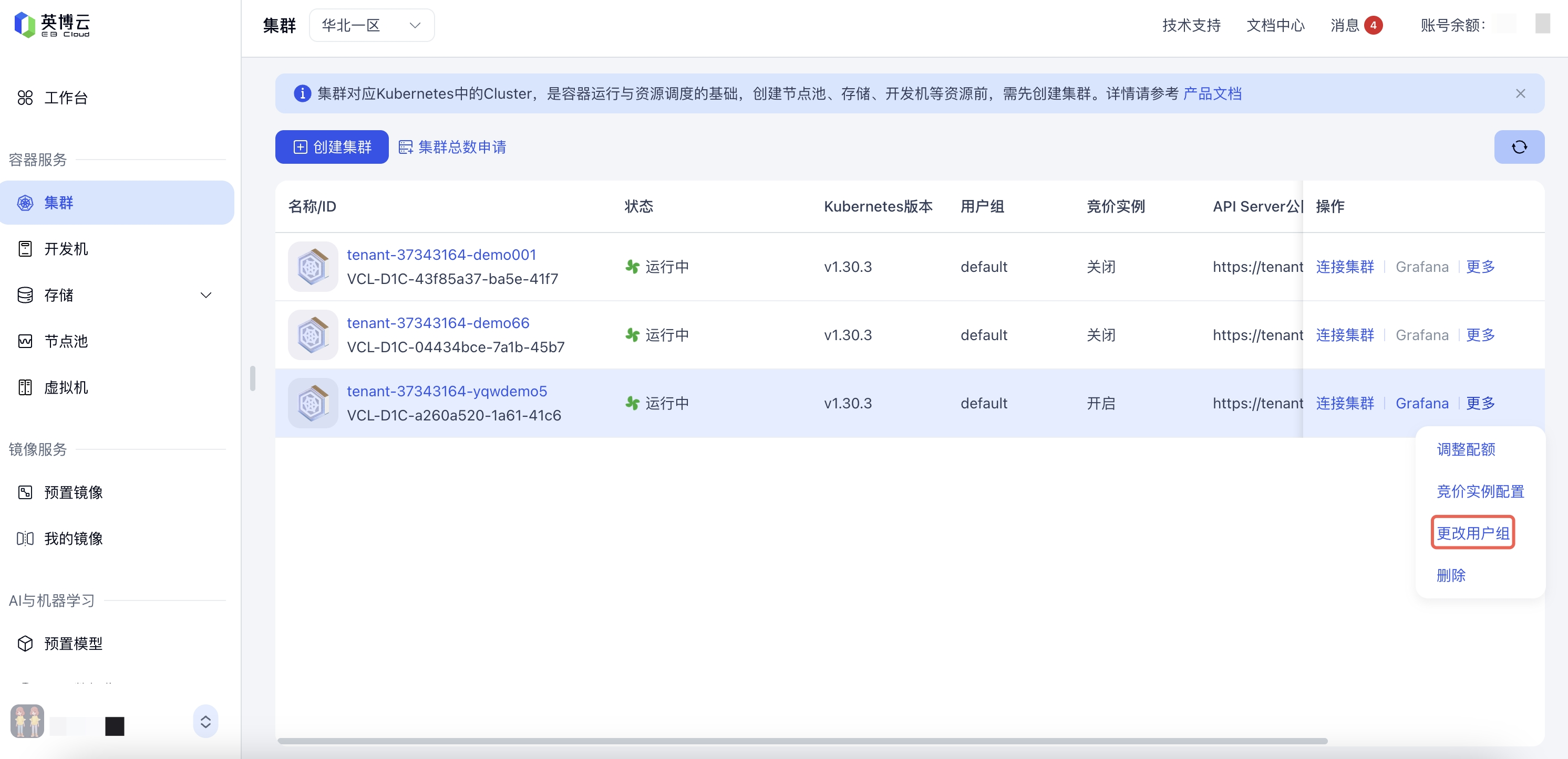 用户组是英博云为用户提供的一套云资源管理系统,用来管理云资源的归属问题,常用于财务分账和分组运维等业务场景。更改用户组用来更改集群的归属。