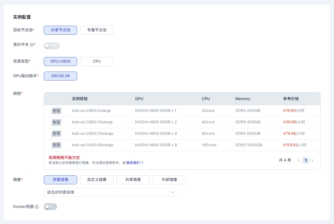 | 规格 | 选择不同GPU或CPU资源的规格 |