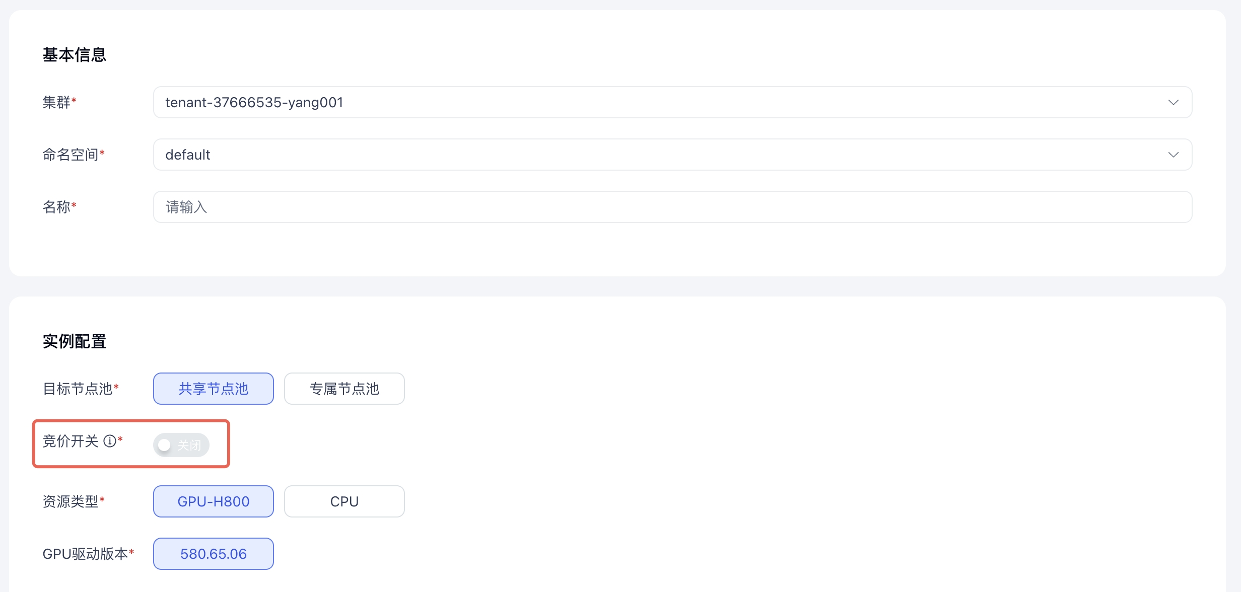 - 在开发机列表页面,单击左上角 创建开发机,弹出开发机创建页面,开启竞价开关。