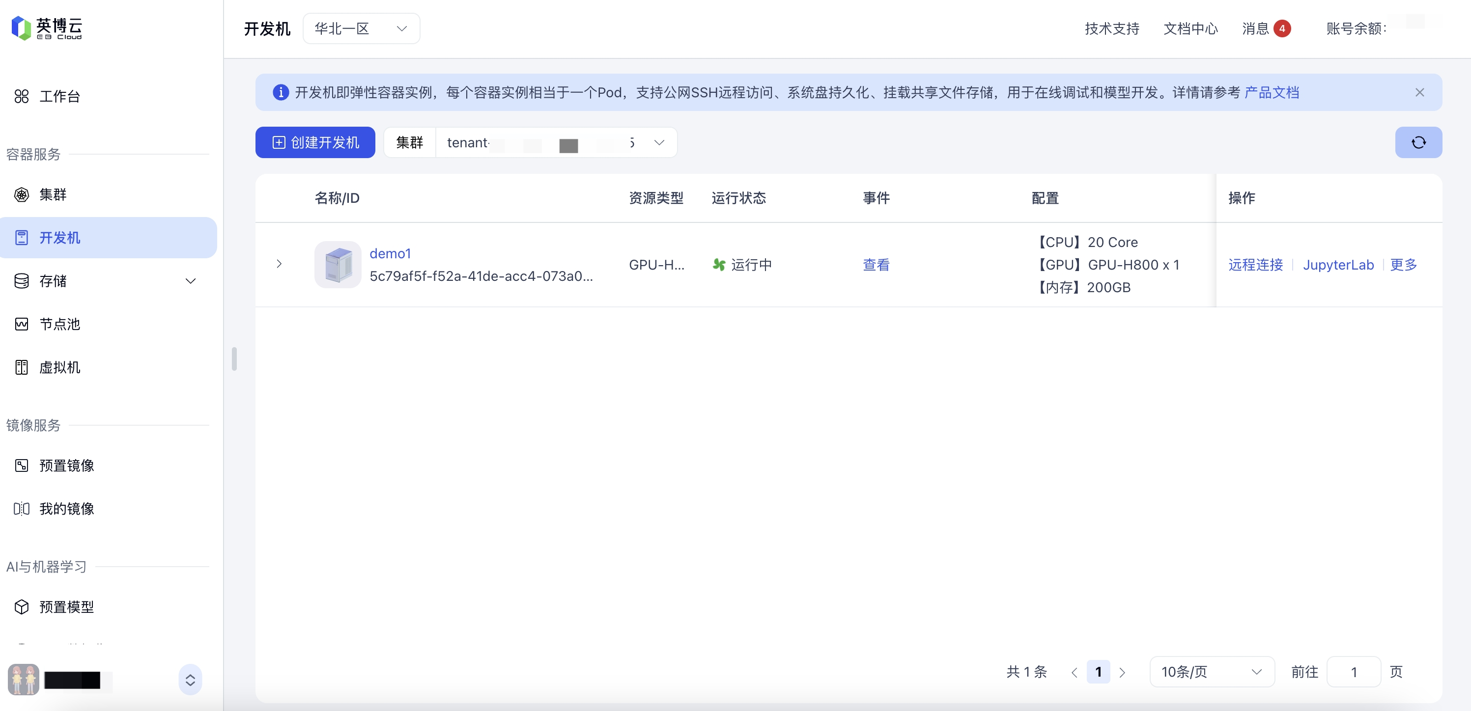 - Docker支持:支持开发机启用Docker功能,允许用户在开发机内运行其它容器。