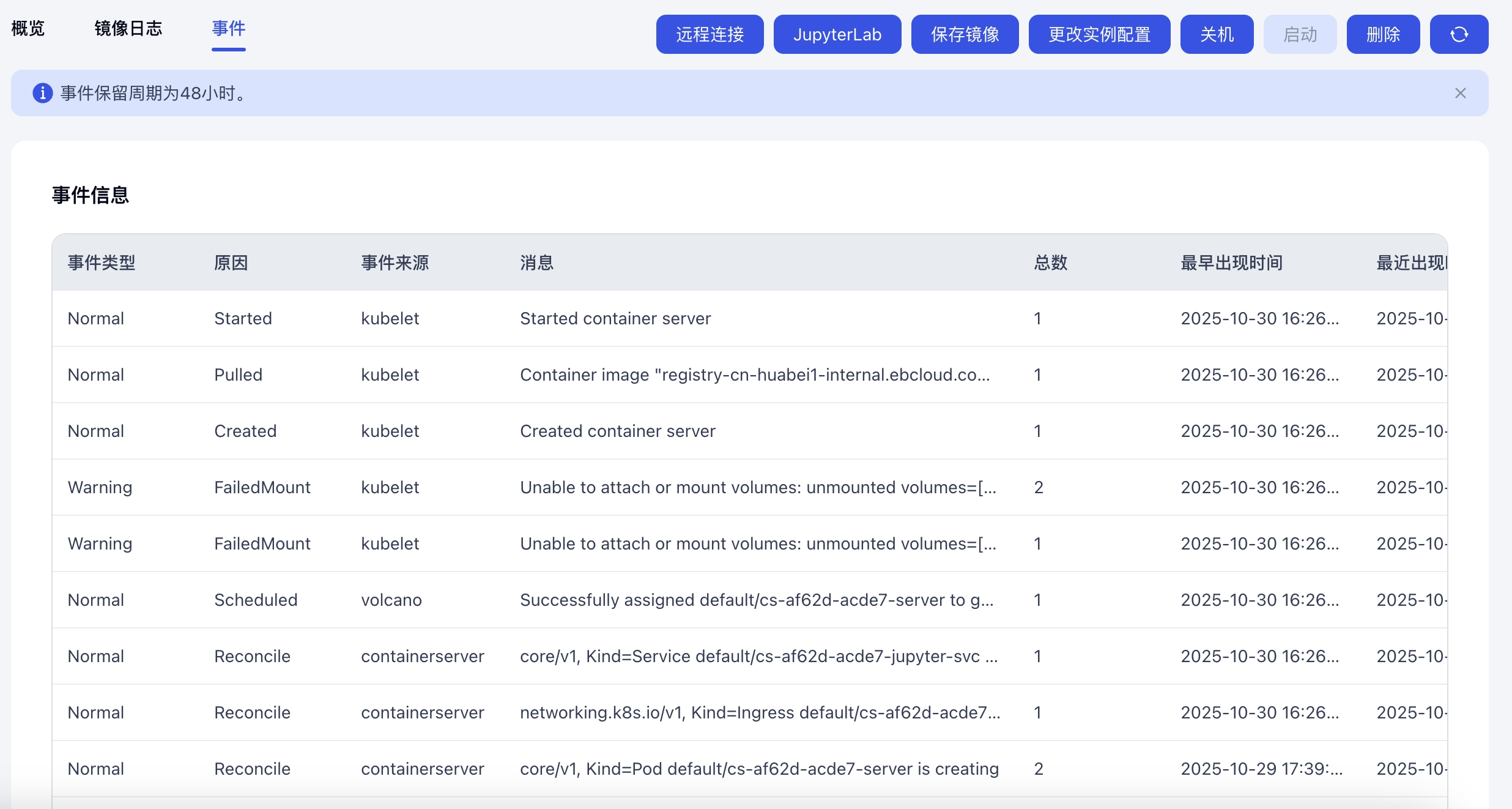 开发机的事件仅保留48小时。