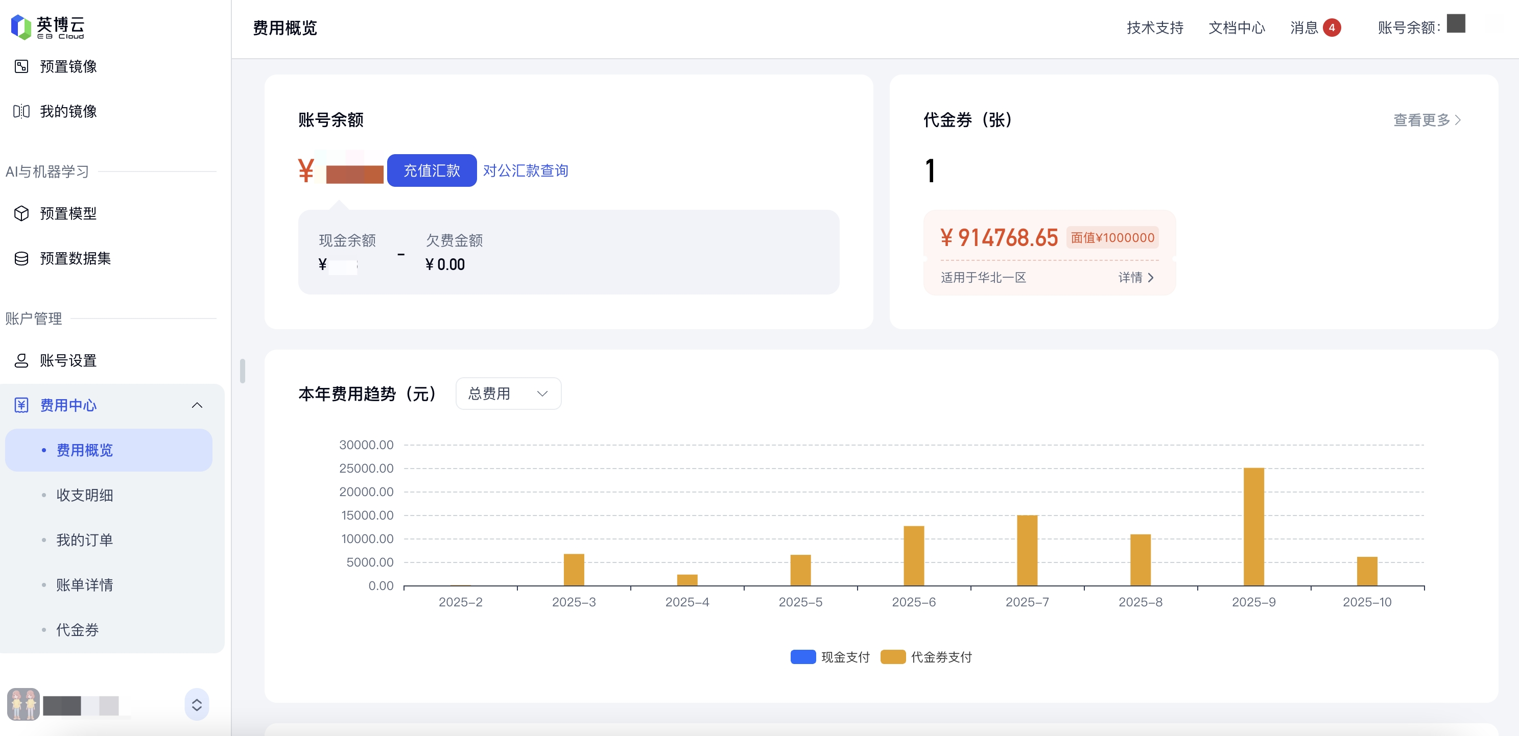 入口: 英博云页面左侧菜单栏中单击 费用中心 下拉菜单项,选择 费用概览 进入费用概览页面。