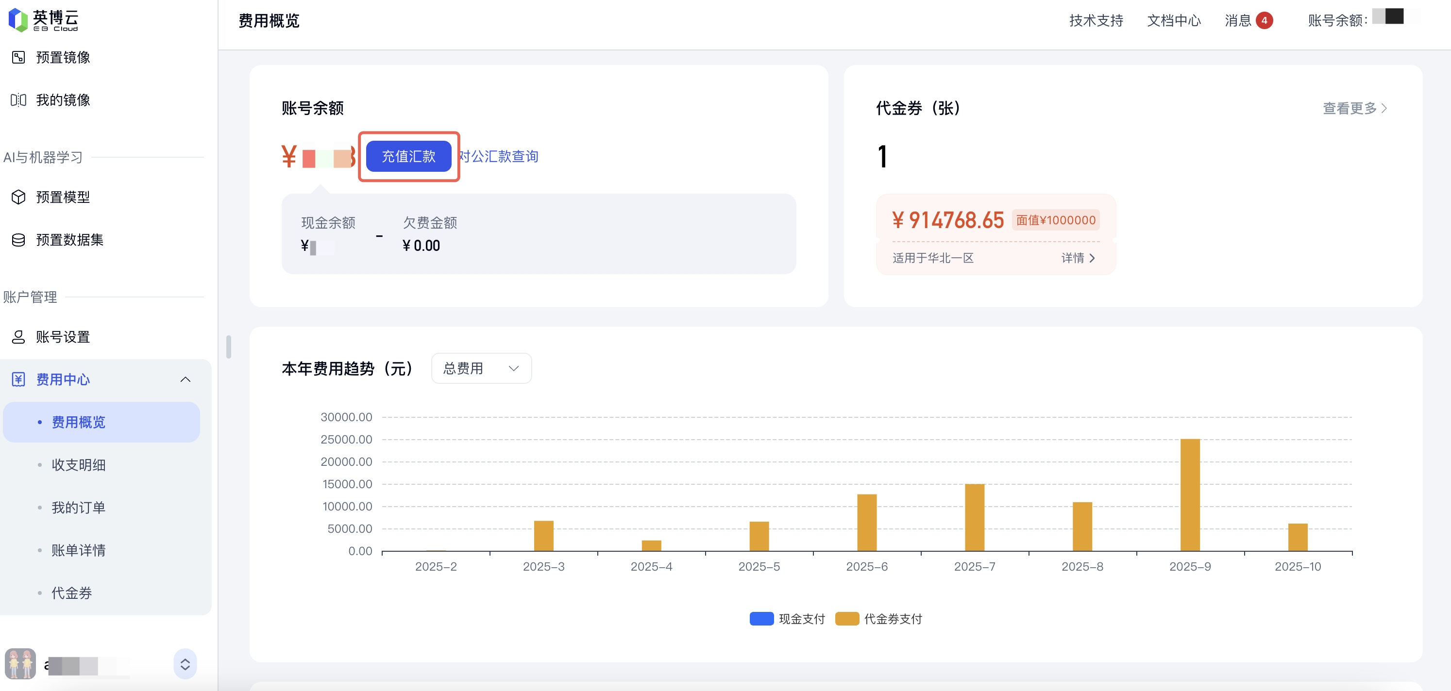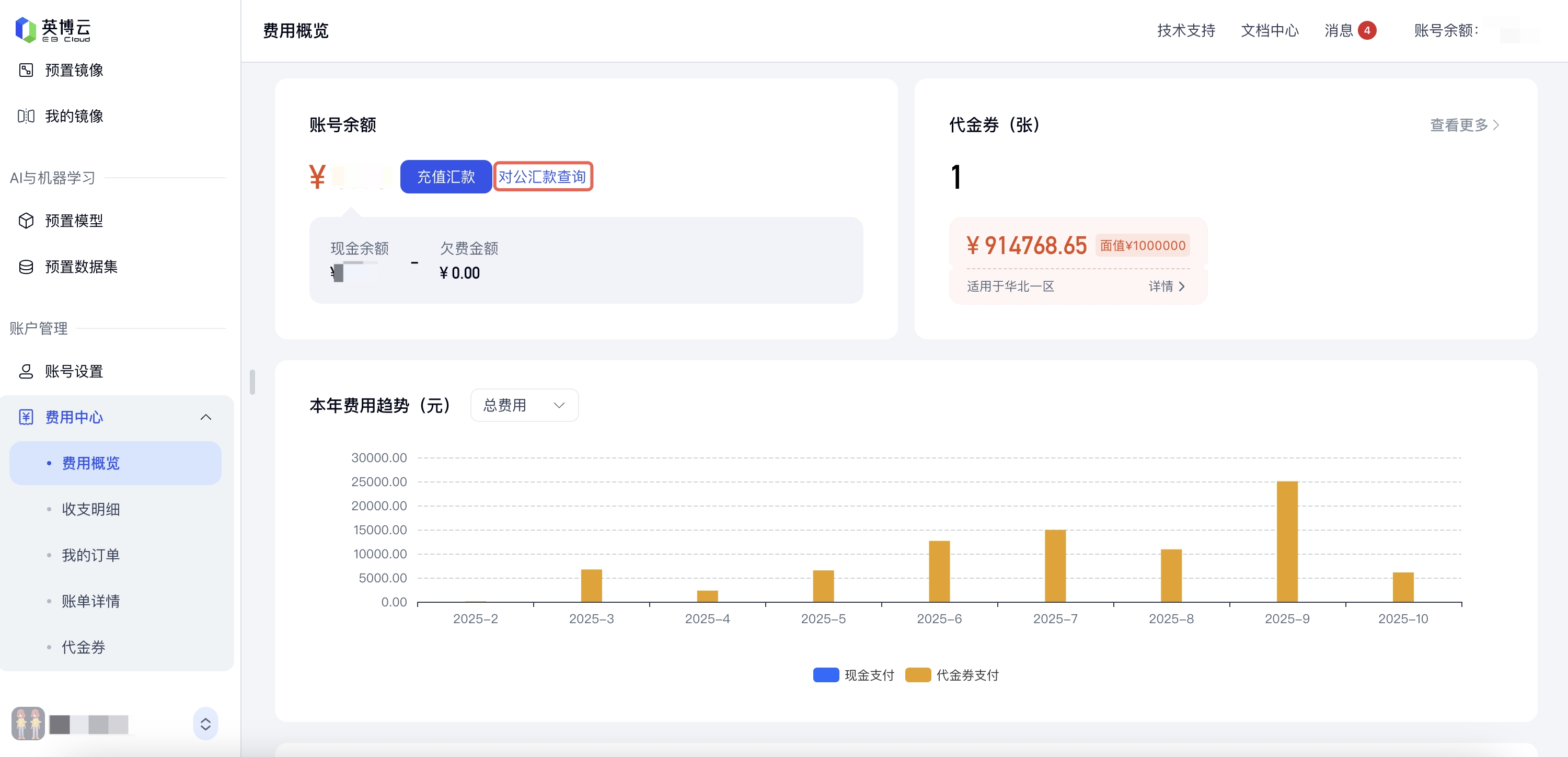 费用概览用于展示用户余额、优惠券、年度账单汇总等信息;同时支持用户进行充值汇款、查看收支明细、查看对公汇款记录等操作。