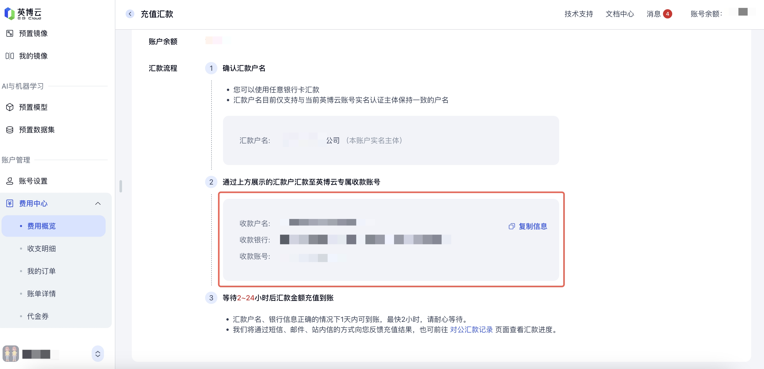 1. 对公汇款仅支持“企业认证”账号使用,汇款户名需与当前英博云账号企业实名认证主体保持一致。