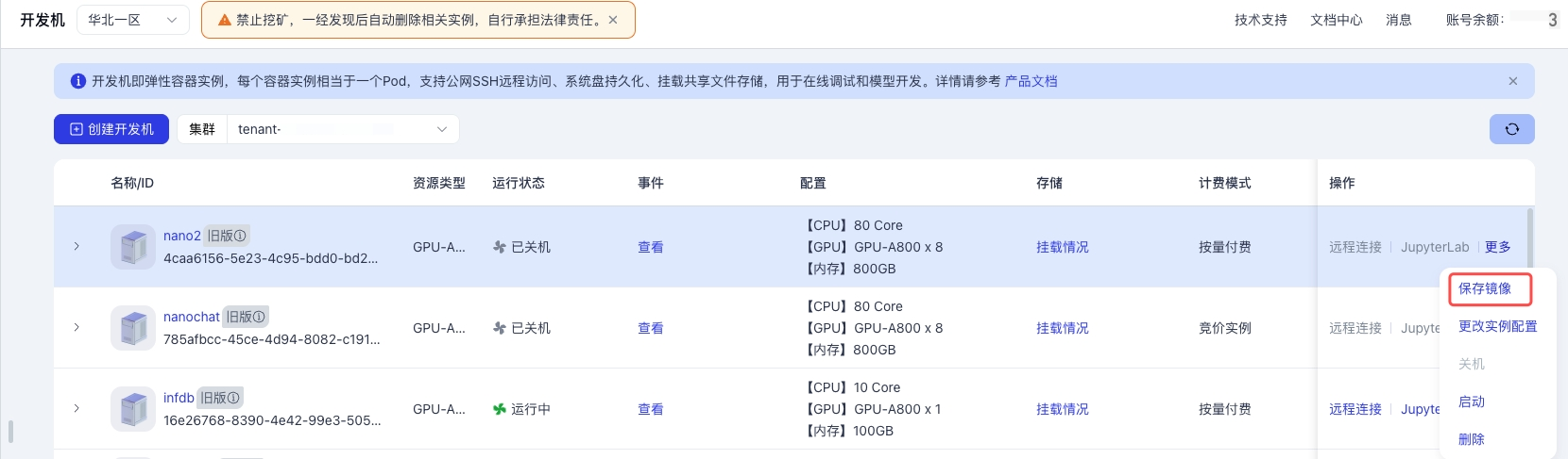 - 在开发机列表页面,选择旧版开发机,选择 操作 > 保存镜像,配置镜像标签的参数,单击确定即可。