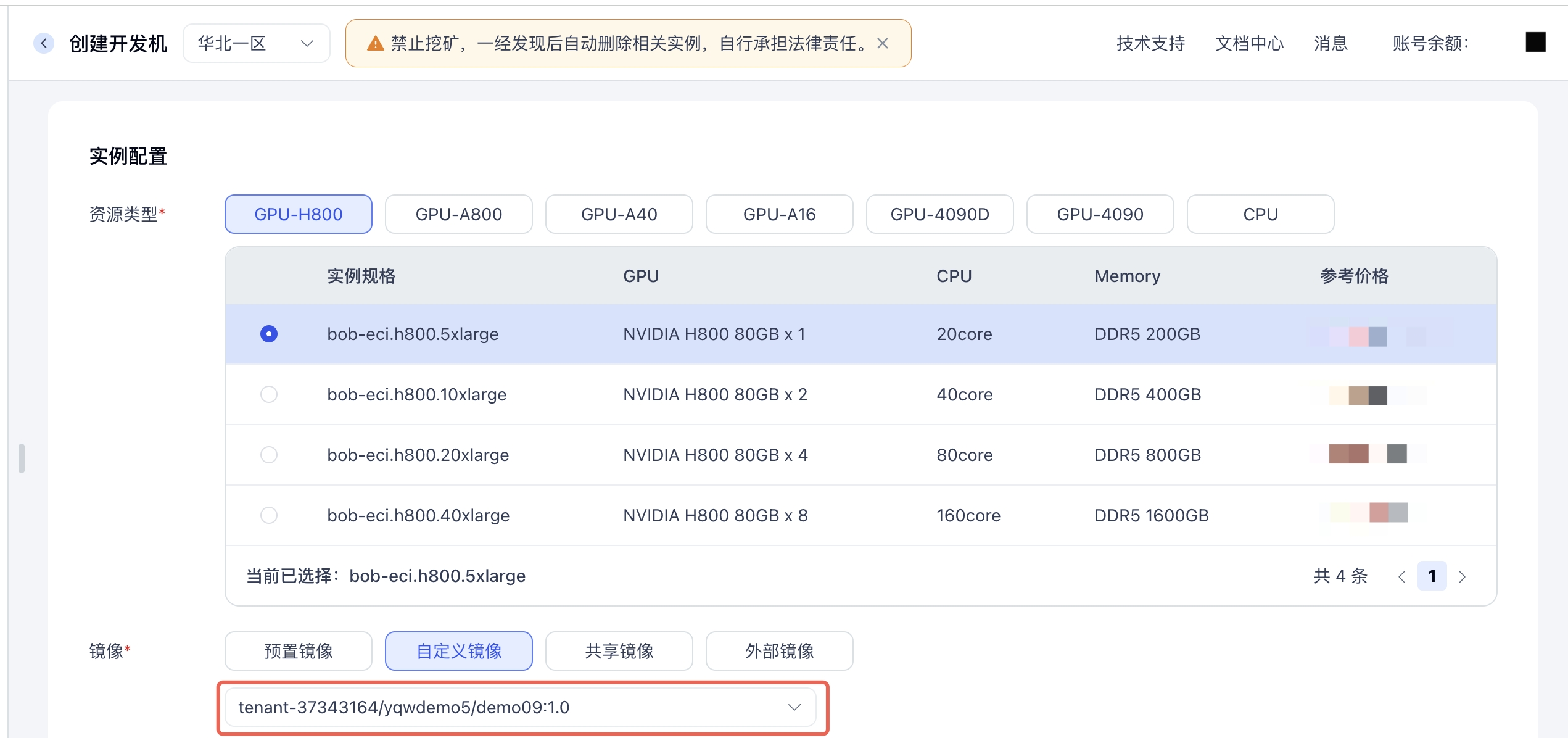 - 在开发机列表页面,选择 创建,在创建页面挂载旧版开发机的共享存储,使用第一步保存的自定义镜像启动。
