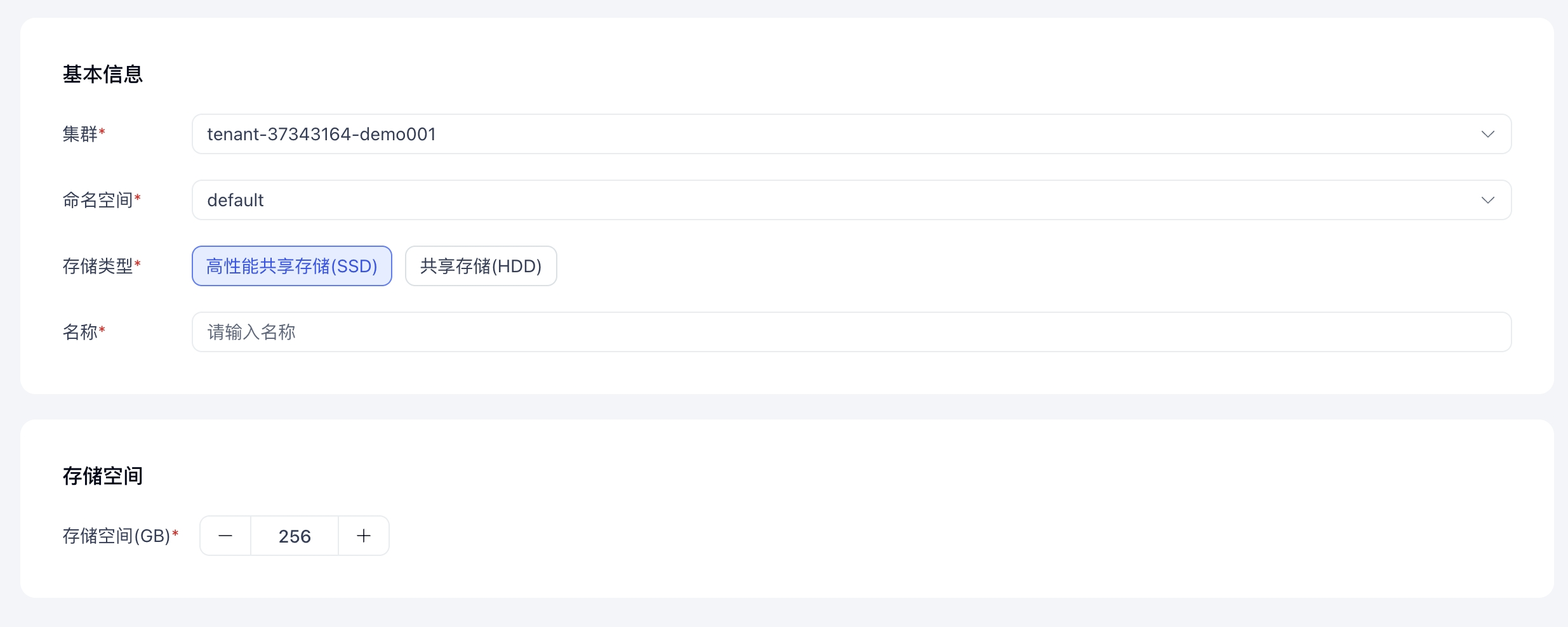 - 输入【名称】、选择【集群和命名空间】、选择【存储类型】-配置【存储空间大小】。