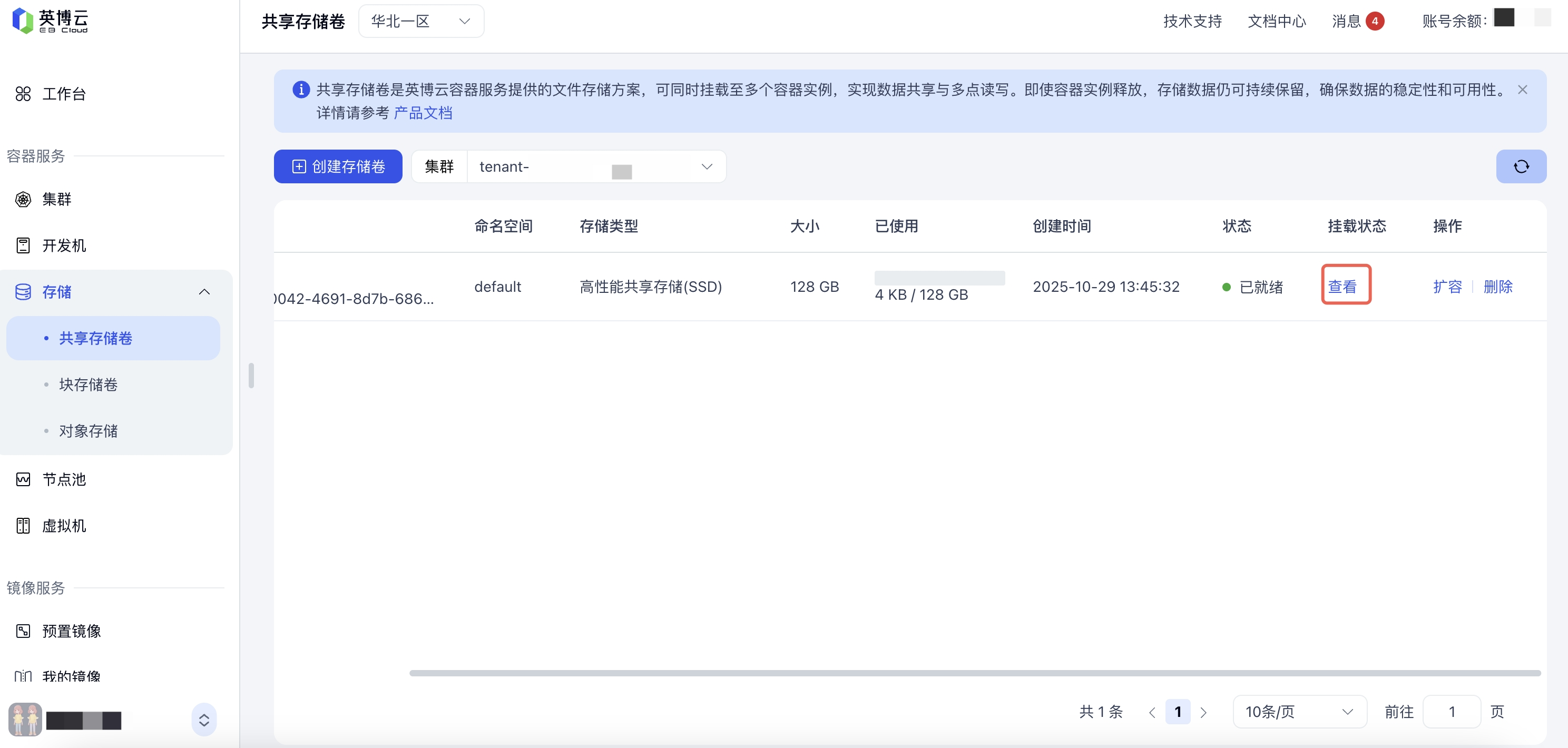- 在共享存储列表页面,选择需要查看的存储卷,在挂载状态栏单击 查看。