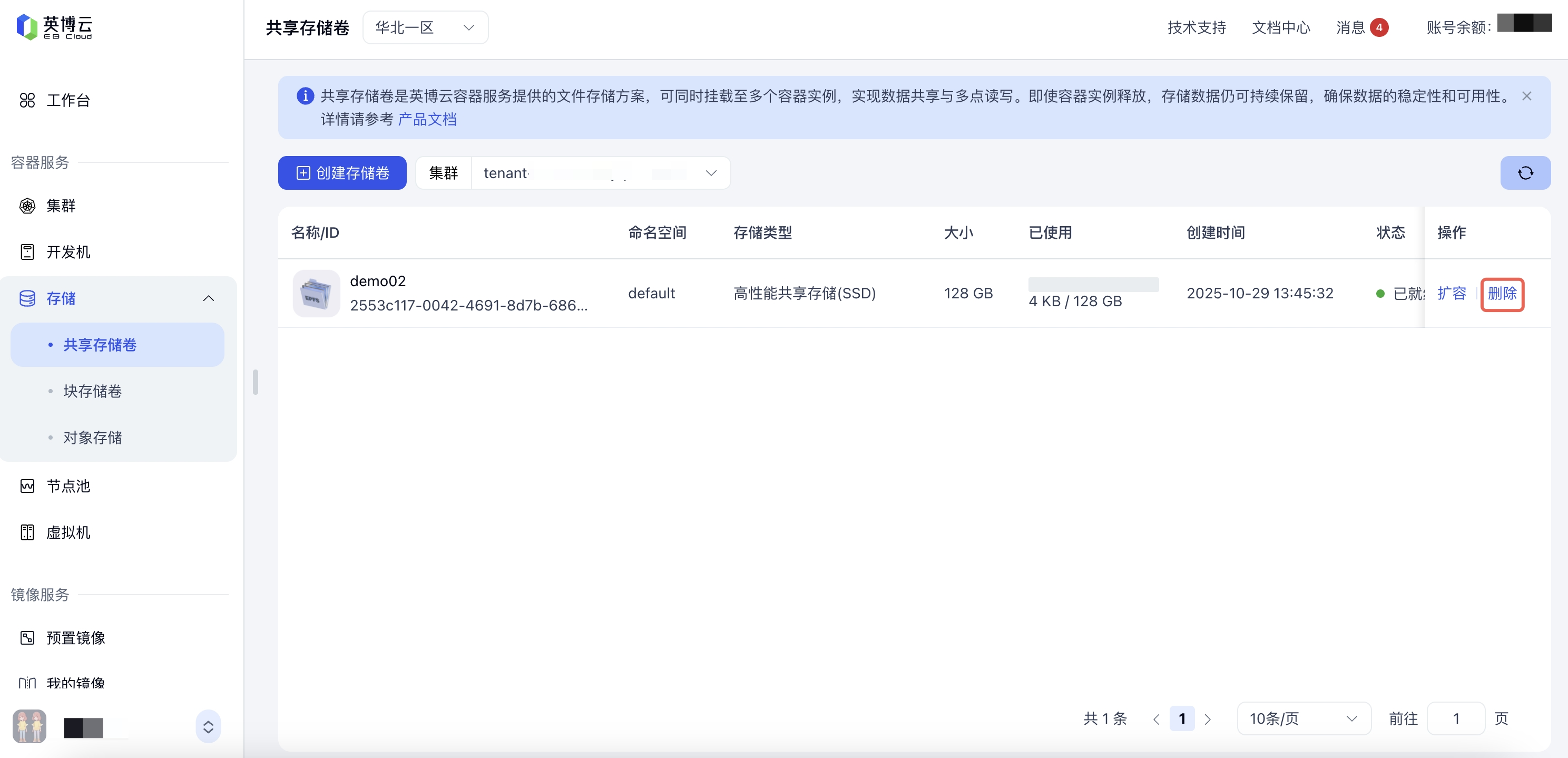 当您不再需要共享存储卷和其中的数据时,可以删除对应的存储卷,操作步骤如下:
