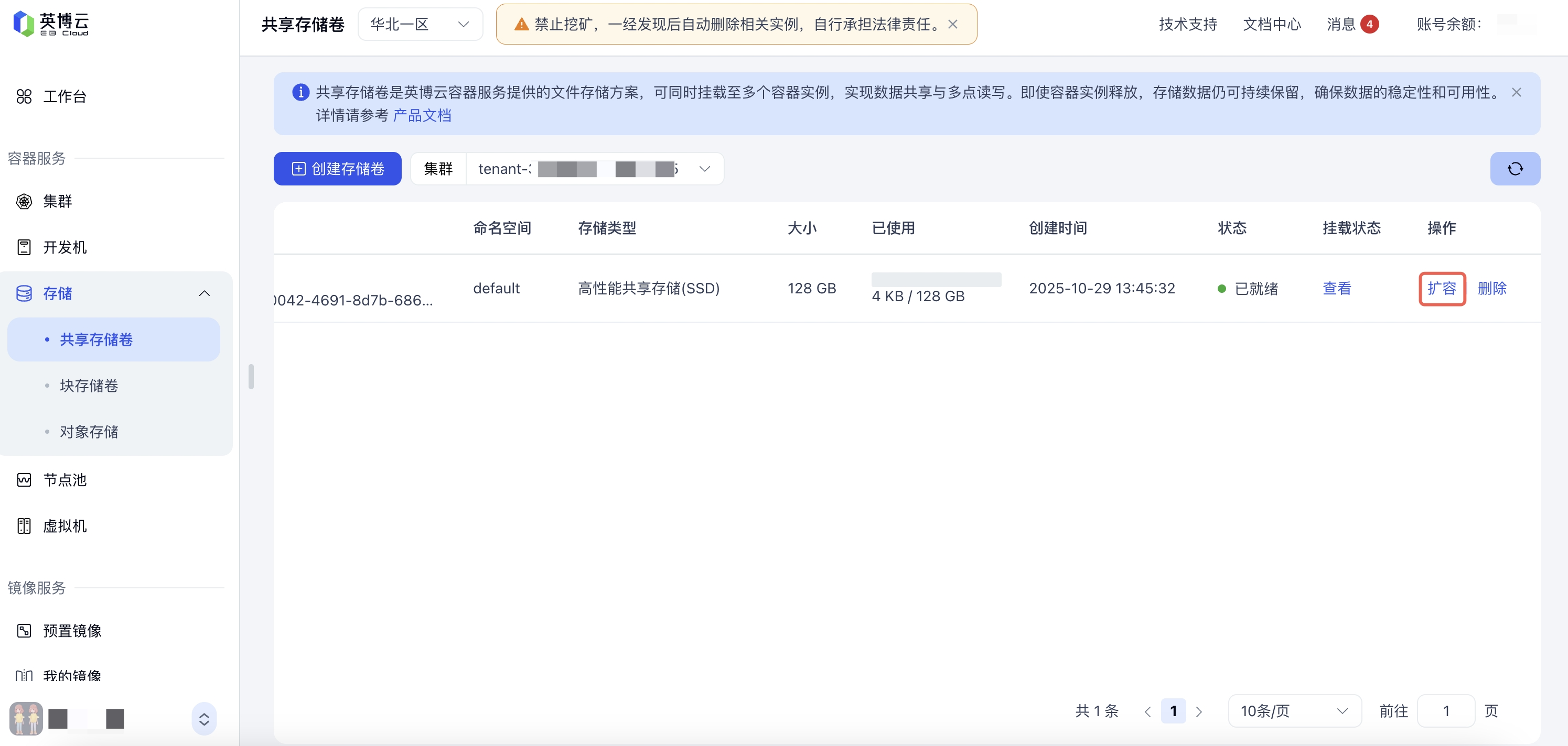 - 在存储列表页面,选择需要扩容的存储卷,单击操作栏 扩容。
