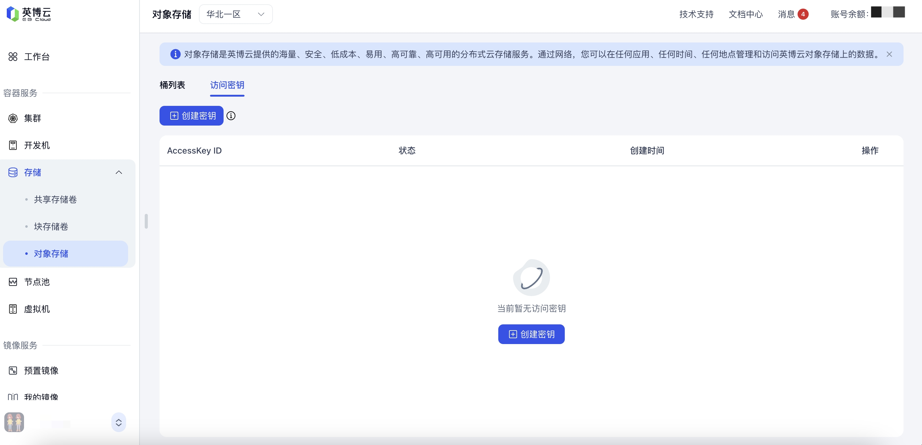 - 在页面左侧菜单栏中单击 存储 下拉菜单项,选择 对象存储 进入对象存储桶列表页面,点击桶列表右侧 访问密钥 TAB页签切换访问密钥页面。